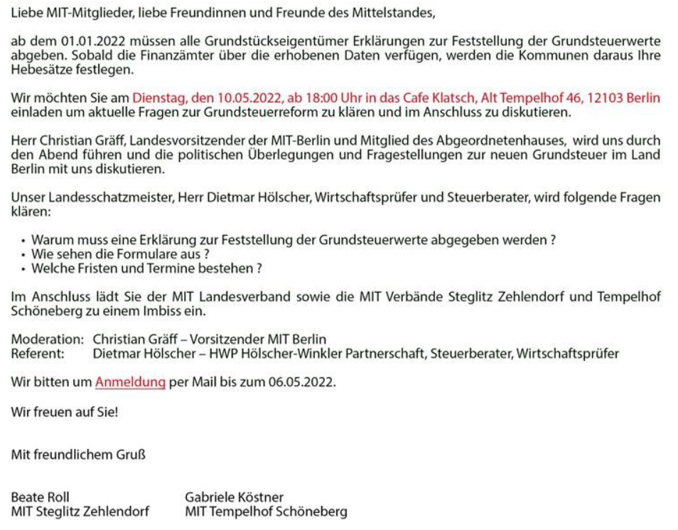 Liebe Mitglieder, sehr geehrte Freunde der MIT Mittelstands- und Wirtschaftsvereinigung Steglitz-Zehlendorf!