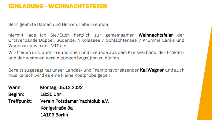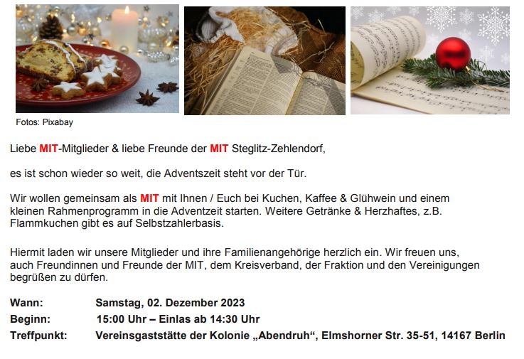 was wäre die Adventszeit ohne einer gemeinsamen Weihnachtsfeier mit Ihnen / Euch, den MIT Mitgliedern sowie dem Ortsverband Düppel und der Frauen Union Steglitz-Zehlendorf bei