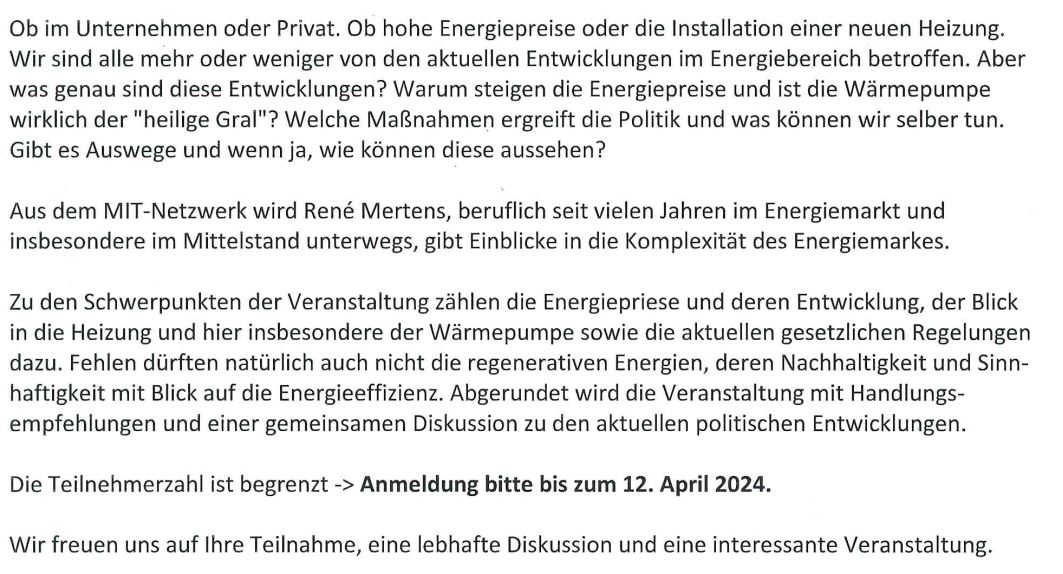 Sehr geehrte Damen und Herren, liebe MIT-Mitglieder und Interessierte,