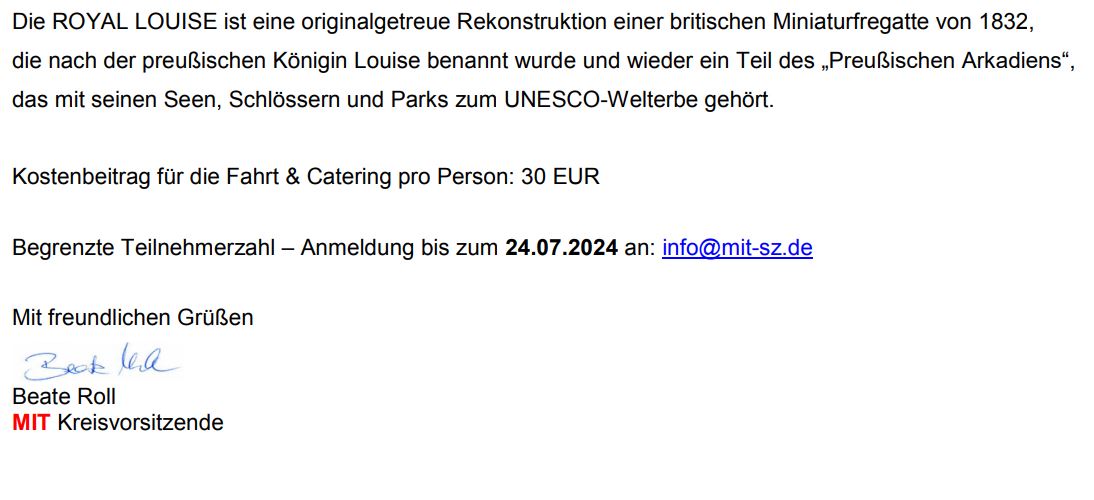 Bitte melden Sie sich und Ihre Begleitperson namentlich zu der Veranstaltung per Mail (info@mit-sz.de) an. Gäste sind wie immer herzlich willkommen.