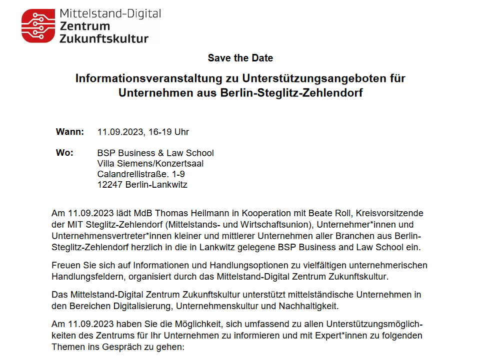 Die Veranstaltung wird von der Digitalagentur Berlin und bezirklichen Wirtschaftsförderung Steglitz-Zehlendorf durchgeführt und richtet sich an Unternehmer, Dienstleister und Interessierte.