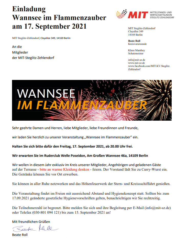 Am 21. September erstrahlt der Wannsee wieder im Feuerzauber des Höhenfeuerwerks. Wir laden Sie herzlich ein, diesen Abend mit Mitgliedern und Freunden der MIT Steglitz-Zehlendorf zu verbringen. Genießen Sie den Abend beim traditionsreichen Berliner Ruderclub „Welle-Poseidon“ mit bestem Blick auf das Höhenfeuerwerk der Stern- und Kreisschifffahrt.