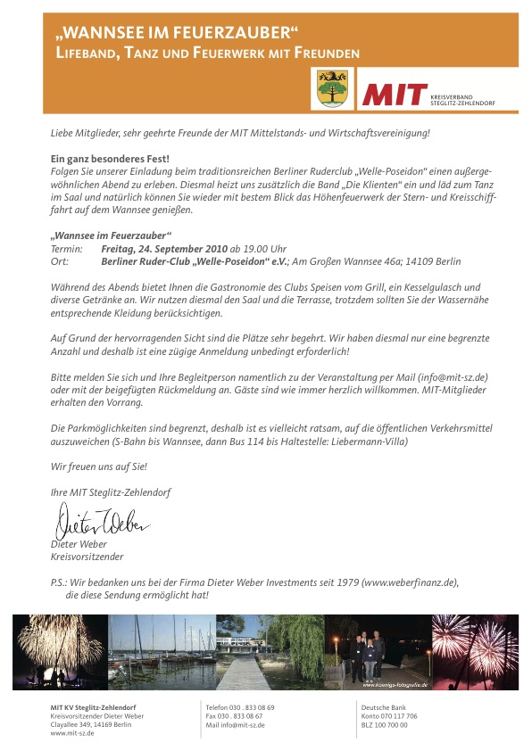 Am 21. September erstrahlt der Wannsee wieder im Feuerzauber des Höhenfeuerwerks. Wir laden Sie herzlich ein, diesen Abend mit Mitgliedern und Freunden der MIT Steglitz-Zehlendorf zu verbringen. Genießen Sie den Abend beim traditionsreichen Berliner Ruderclub „Welle-Poseidon“ mit bestem Blick auf das Höhenfeuerwerk der Stern- und Kreisschifffahrt.